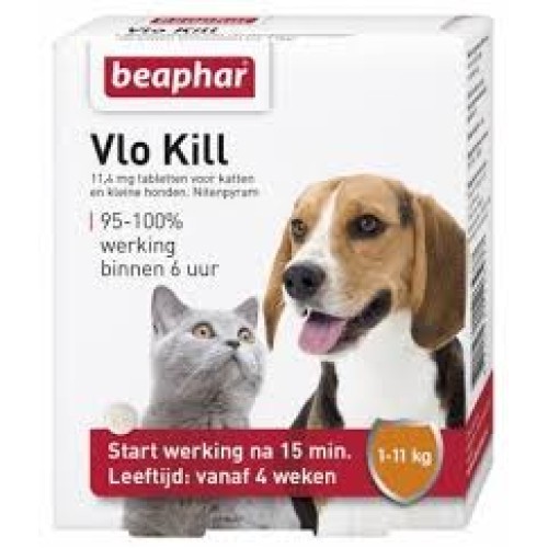 Vlo Kill+ tot 11 kg voor kleinere honden en katten en voor pups vanaf 4 weken en 1 kg zwaar. Werkt snel en direct, binnen 24 uur zijn alle vlooien dood. Effect op de vlooien word waargenomen vanaf 15-30 minuten na toediening van het product aan het dier.